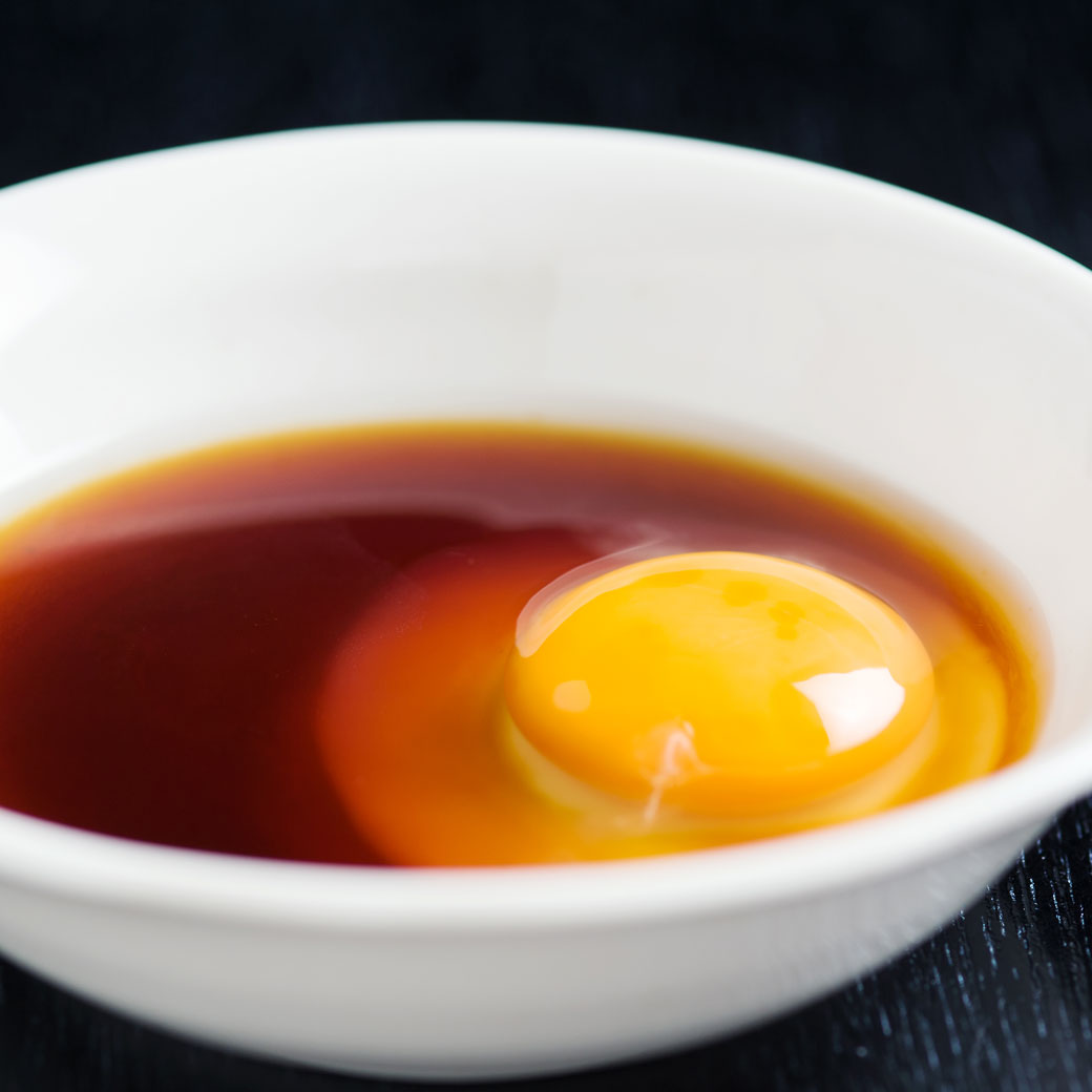 鶏肉に火が通ったら、卵入りの秘伝醤油だれにくぐらせてパクっ!